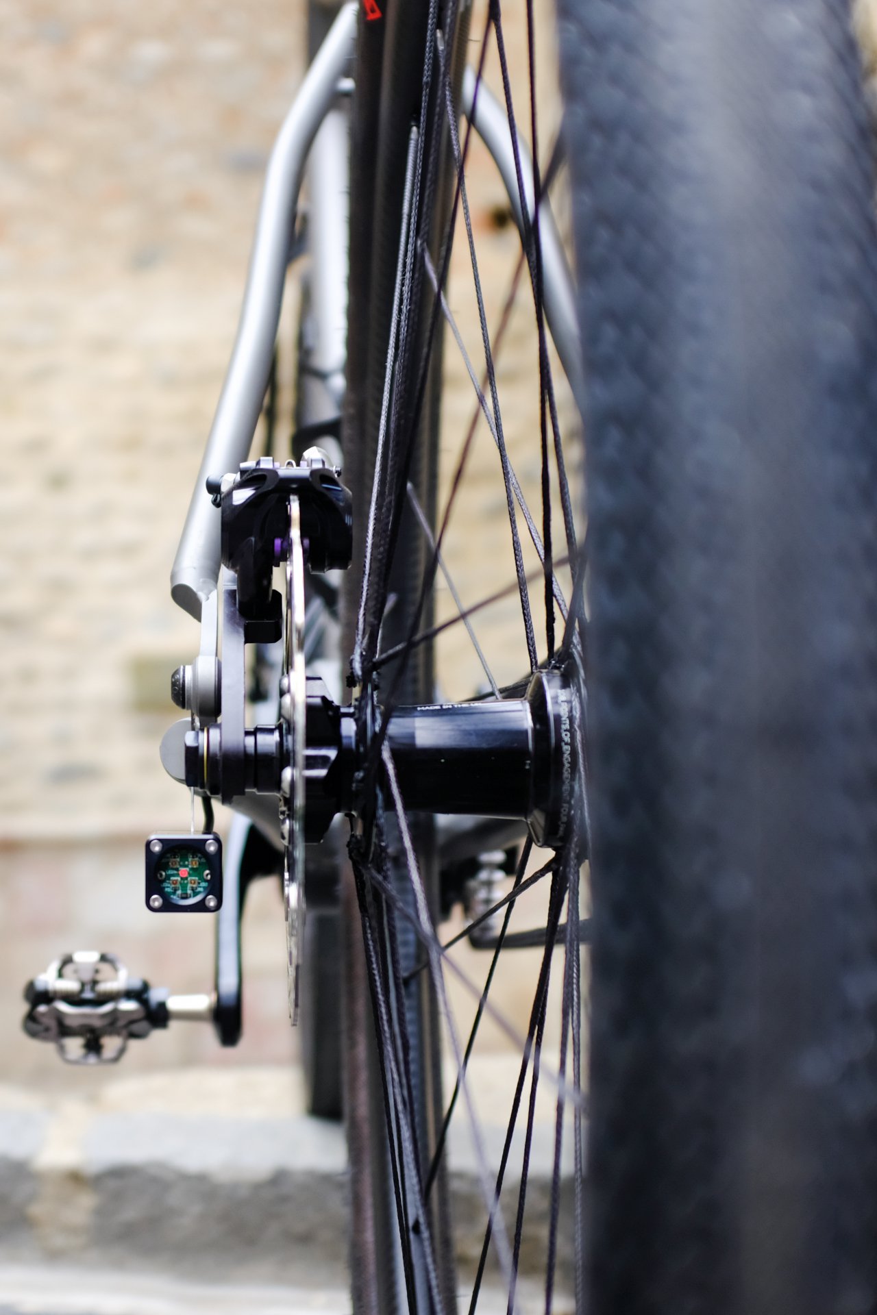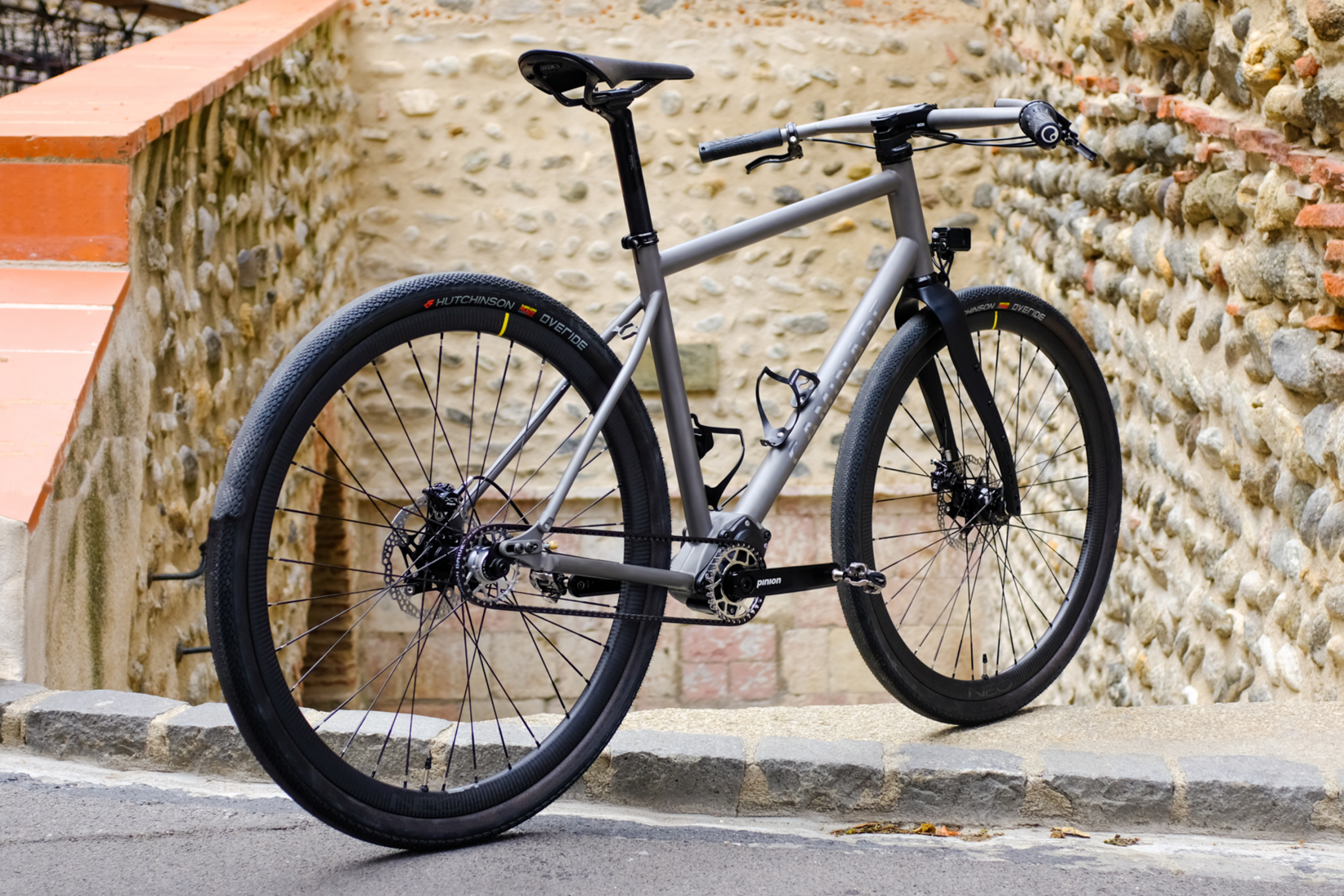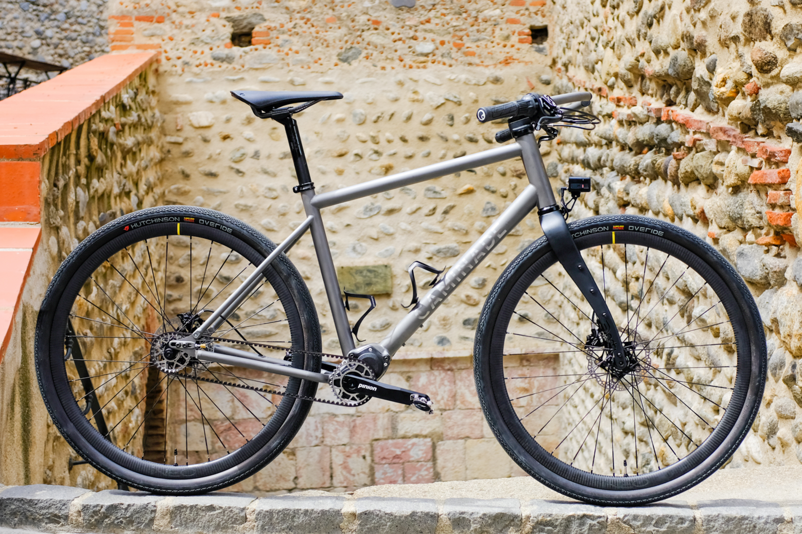 Le point de départ, c’est un cadre en titane, fabriqué sur mesure dans notre atelier d’Ille-sur-Têt par Erwan, notre soudeur. Ce cadre est pensé pour accueillir une boîte de vitesses Pinion C1.12, couplée à une transmission par courroie Carbon Gates. L’idée de Jean-Jacques était limpide : sécuriser au maximum l’approvisionnement des composants dans la zone UE, et opter pour une transmission d’une durabilité absolue, quasiment sans entretien. D’où le choix de la boîte Pinion, une merveille de technologie fabriquée par nos partenaires allemands.