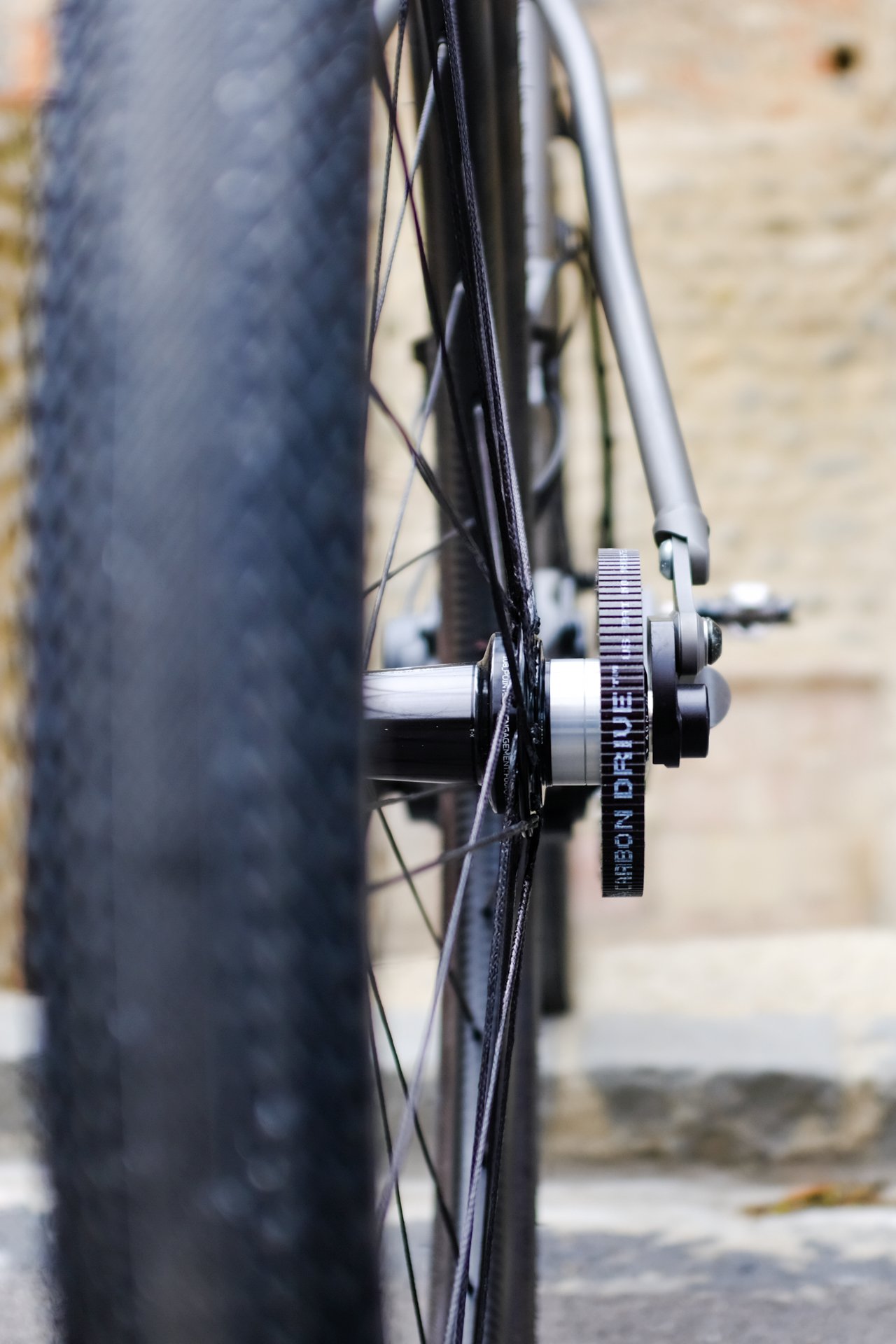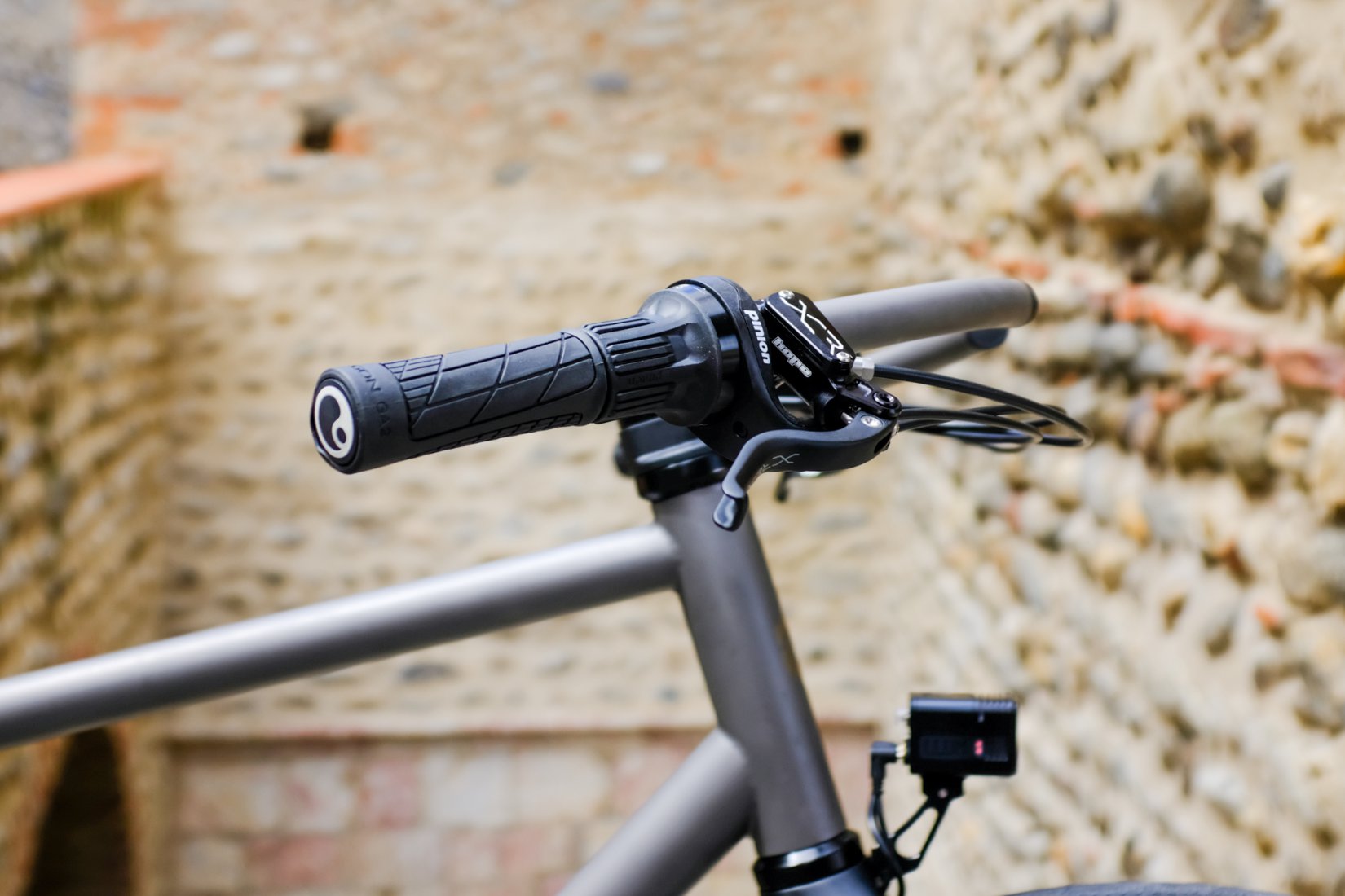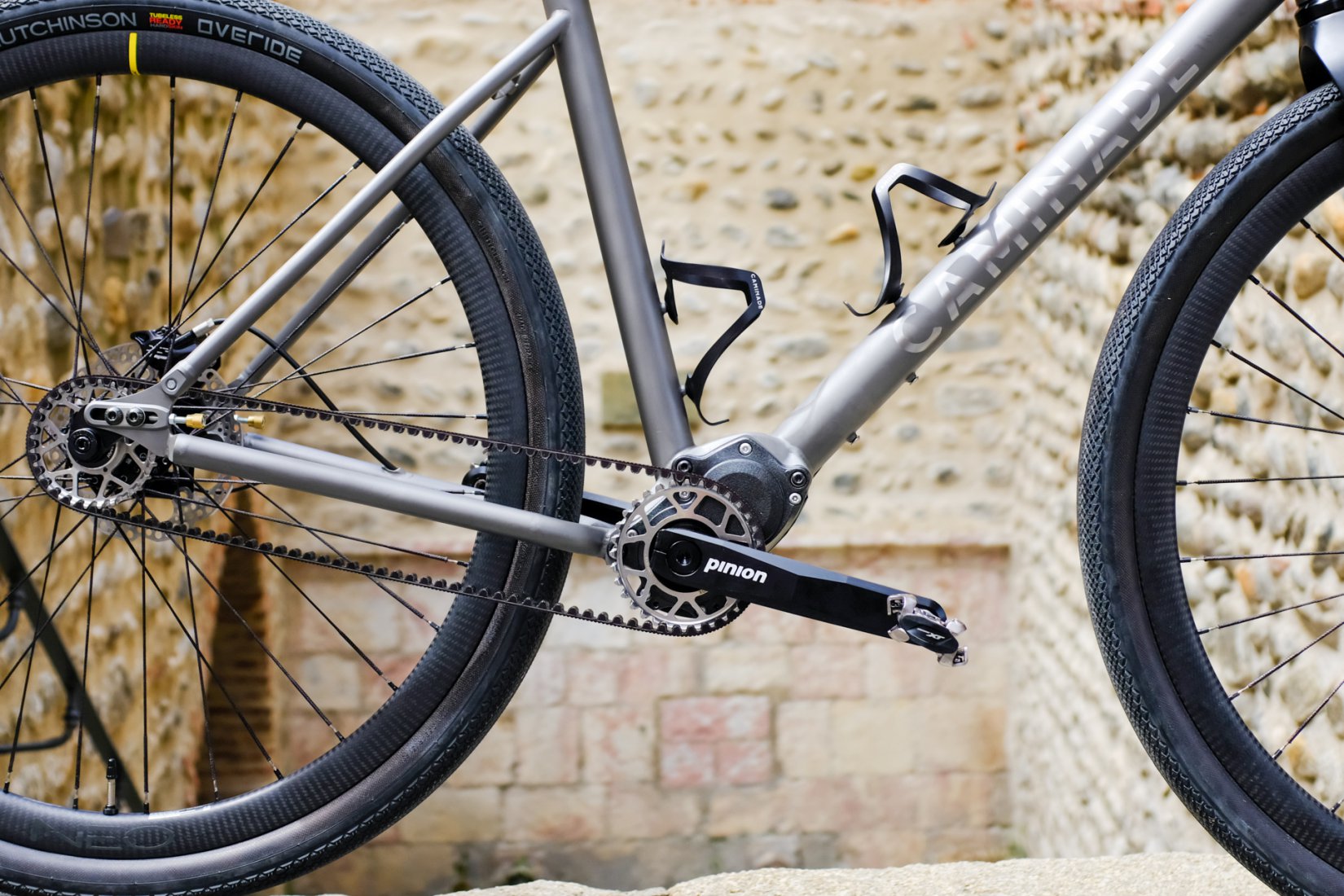 Le point de départ, c’est un cadre en titane, fabriqué sur mesure dans notre atelier d’Ille-sur-Têt par Erwan, notre soudeur. Ce cadre est pensé pour accueillir une boîte de vitesses Pinion C1.12, couplée à une transmission par courroie Carbon Gates. L’idée de Jean-Jacques était limpide : sécuriser au maximum l’approvisionnement des composants dans la zone UE, et opter pour une transmission d’une durabilité absolue, quasiment sans entretien. D’où le choix de la boîte Pinion, une merveille de technologie fabriquée par nos partenaires allemands.