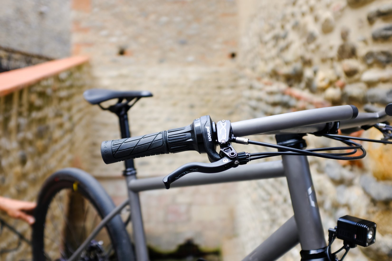 Le choix des périphériques a été confié à Deda pour la fourche, la potence et la tige de selle. Le freinage est assuré par la firme anglaise Hope avec leur paire de freins la plus légère, parfaite pour le gravel : les leviers XCR et les étriers X2.