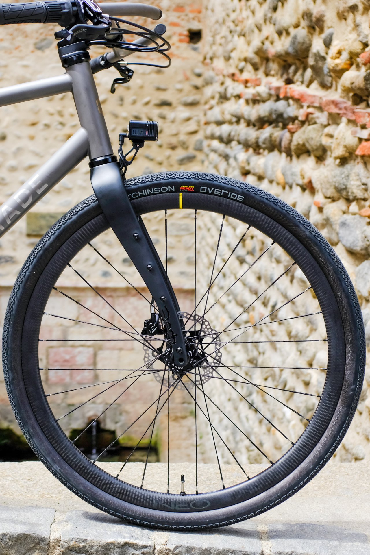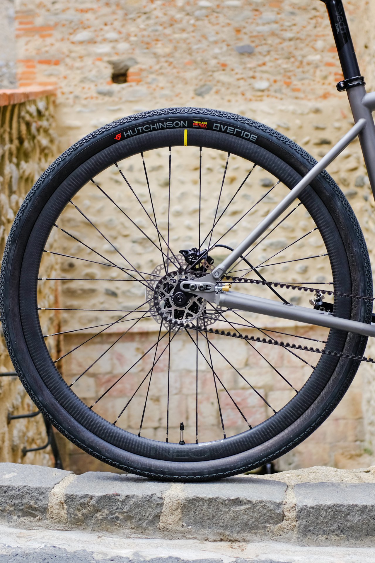 Pour le train roulant, on a fait appel au savoir-faire de NeoWheels, Frank est installé à Trévillach, à seulement 6 km de notre atelier. Il a rayonné à la main un moyeu arrière Hope Pro 5 Trial SS sur des jantes Mavic Open Pro Carbone, le tout assemblé avec des rayons Berd pour alléger l’ensemble et gagner en confort.