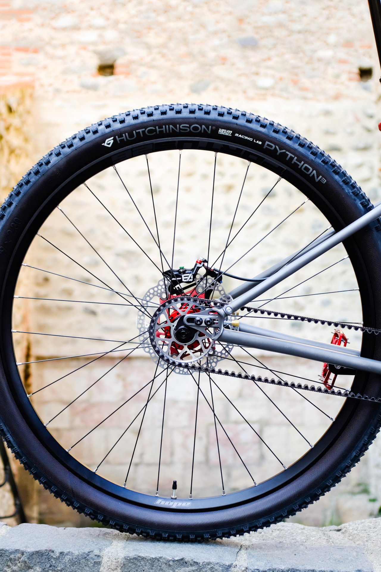 Pour parfaire ce build unique, le choix s'est porté sur une fourche inversée. Cette configuration, héritée du monde motocycliste, offre une rigidité torsionnelle accrue, améliorant la précision du pilotage et la sensation de contrôle dans les passages techniques engagés. C'est le détail ultime qui confirme que ce VTT titane est une machine "par comme les autres".