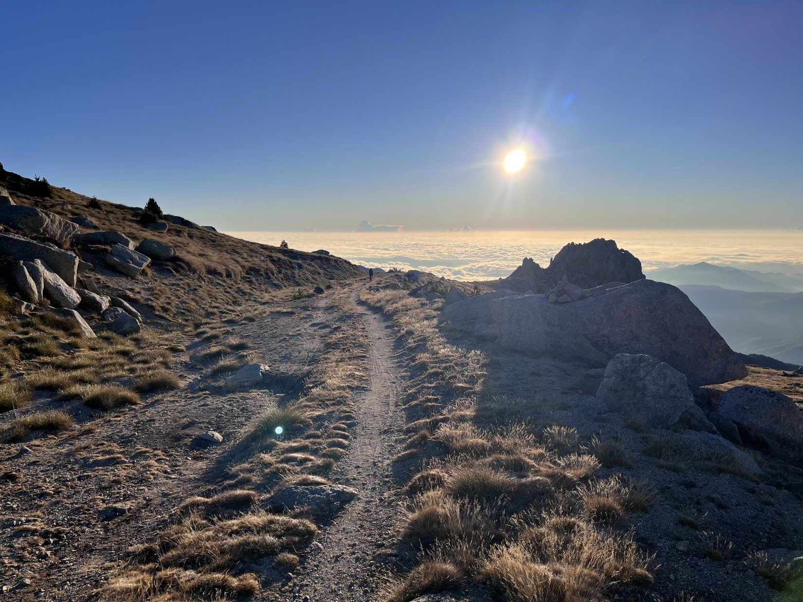 Le jour se lève 🌅, et les paysages sont grandioses, mais j’ai tellement froid que mes doigts refusent d'éteindre ma frontale. Dans la descente vers Prats de Mollo, je croise le mineur Maxime : le seul à prospecter dans ce sens. Un original ! 🤪
